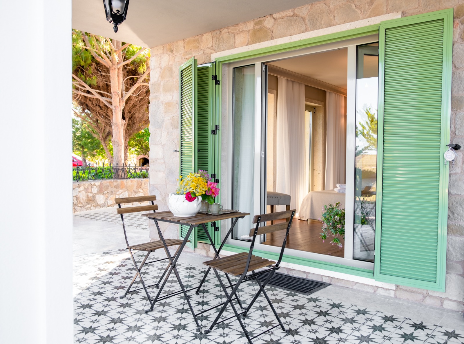 Bir numaralı odamız üç kişilik deniz gören iki bahçe terasa sahip . Toplamda 17 metre kare büyüklüğünde olan odamızda ferah olsun diye açık renk masif mobilya tercih edildi . Banyo duşlu . Seramikler Kütahya porselen tercih edildi . Renk :turkuaz .